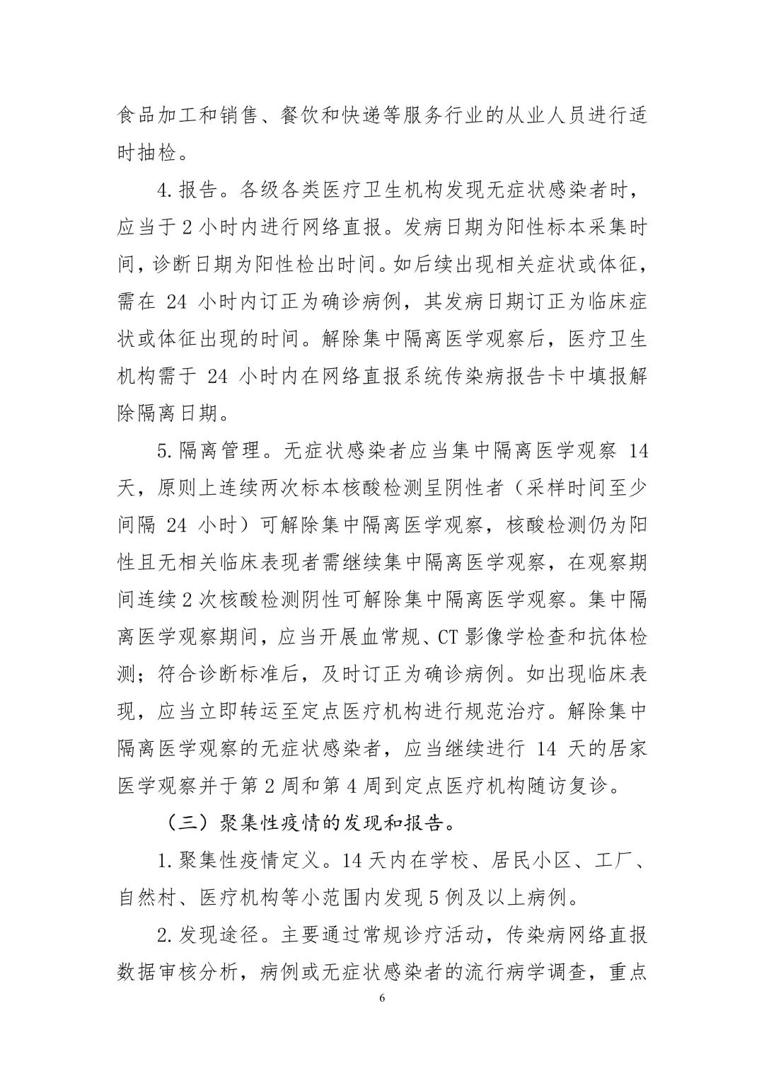 一是根据国内外疫情流行变化,病例流行病学史强调报告病例或无症状感染者社区的旅行史或居住史、病例或无症状感染者接触史等,更加精准科学。二是强调无症状感染者为呼吸道等标本新型冠状病毒病原学检测呈阳性,无相关临床表现,如发热、干咳、咽痛等可自我感知或可临床识别的症状与体征,且CT影像学无新冠肺炎影像学特征者。三是增加多渠道监测预警,要求按照点与面结合、传染病监测系统与其他部门监测系统结合、常规监测与强化监测结合的原则,针对人群和环境开展监测工作。四是完善聚集性疫情定义,根据分区分级标准,将聚集性疫情从“2例及以上病例”修改为“5例及以上病例”。