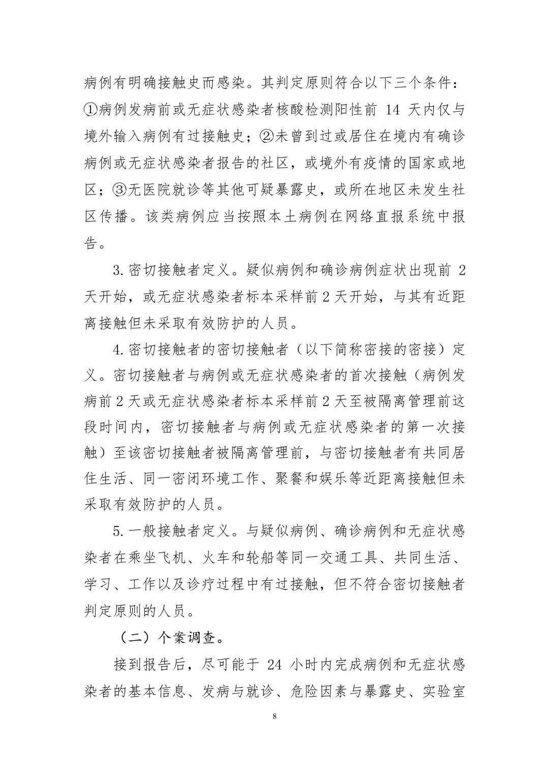 增加境外输入病例、输入继发病例、密切接触者的密切接触者(简称密接的密接)等定义,强调做好个案调查,密接判定、病例主动搜索、聚集性疫情调查及调查信息报告,做好感染来源、污染范围、传播特征和传播链分析。