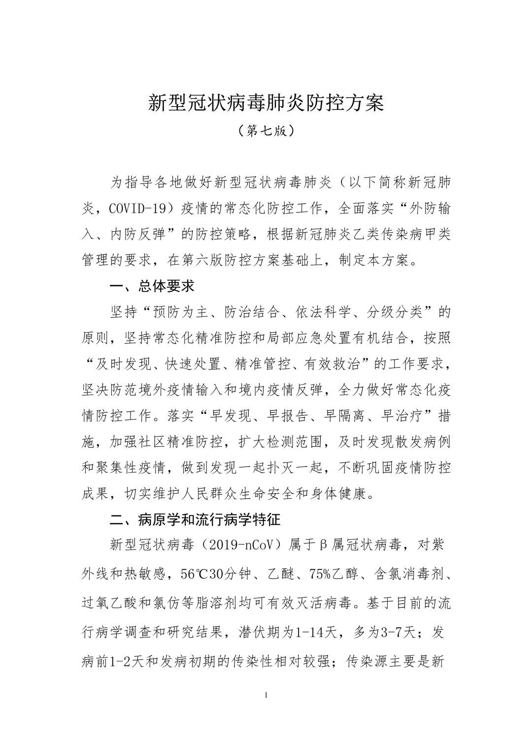 关于印发新型冠状病毒肺炎防控方案(第七版)的通知