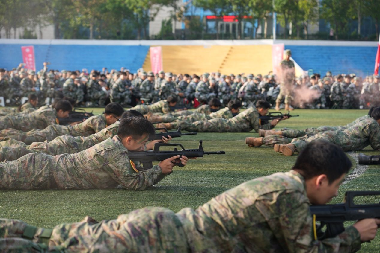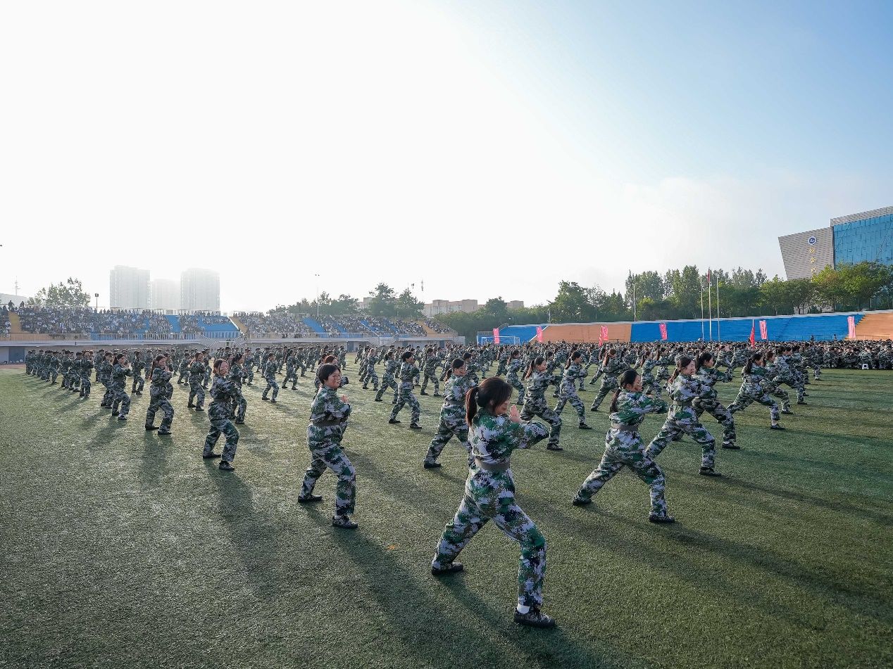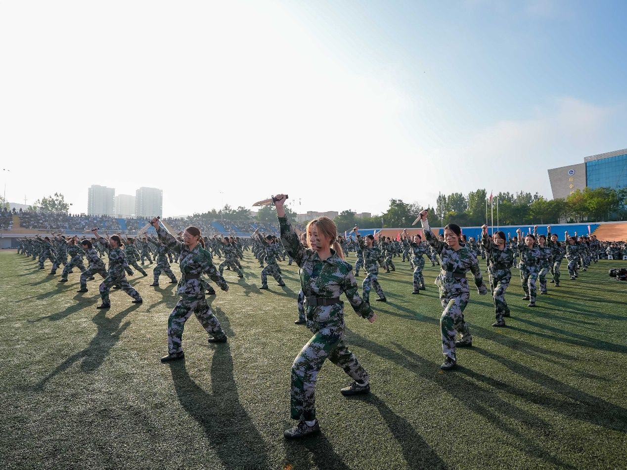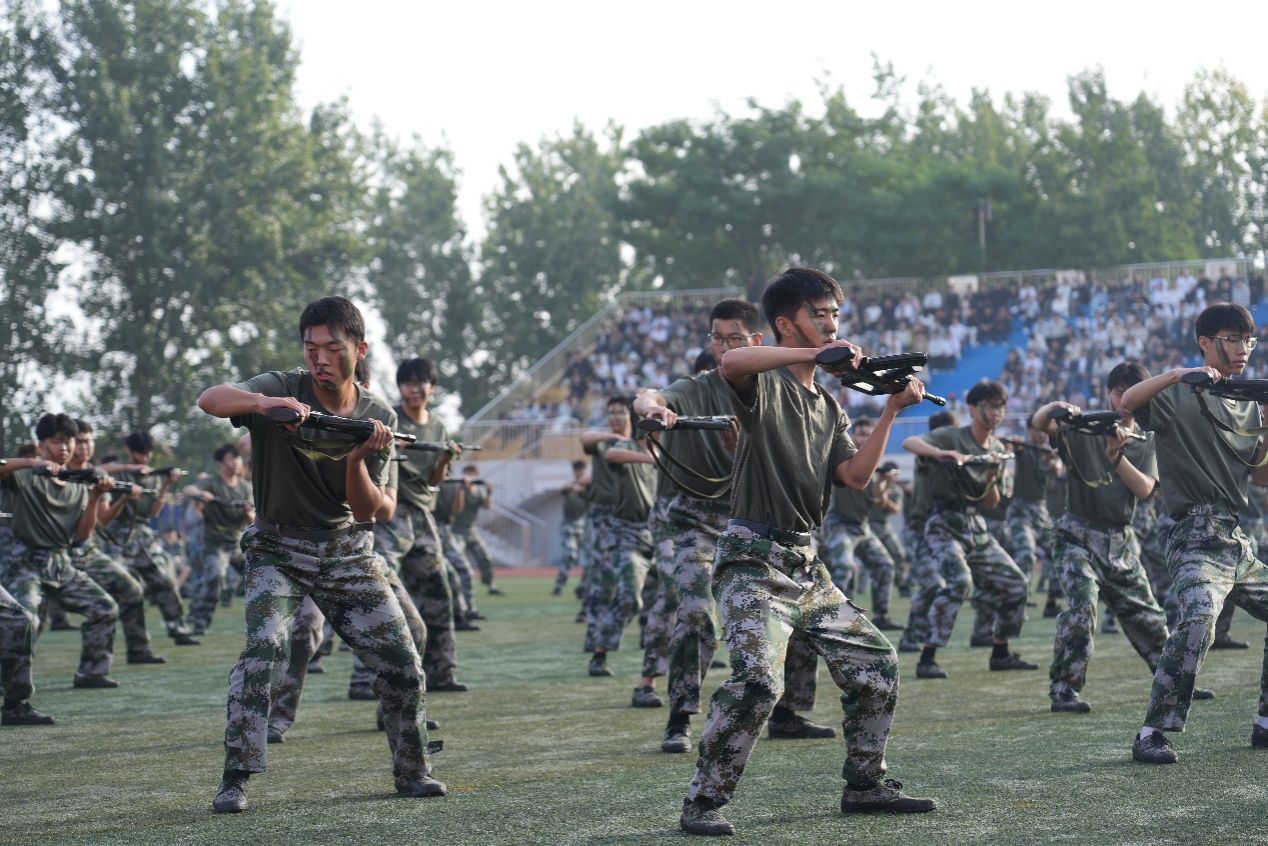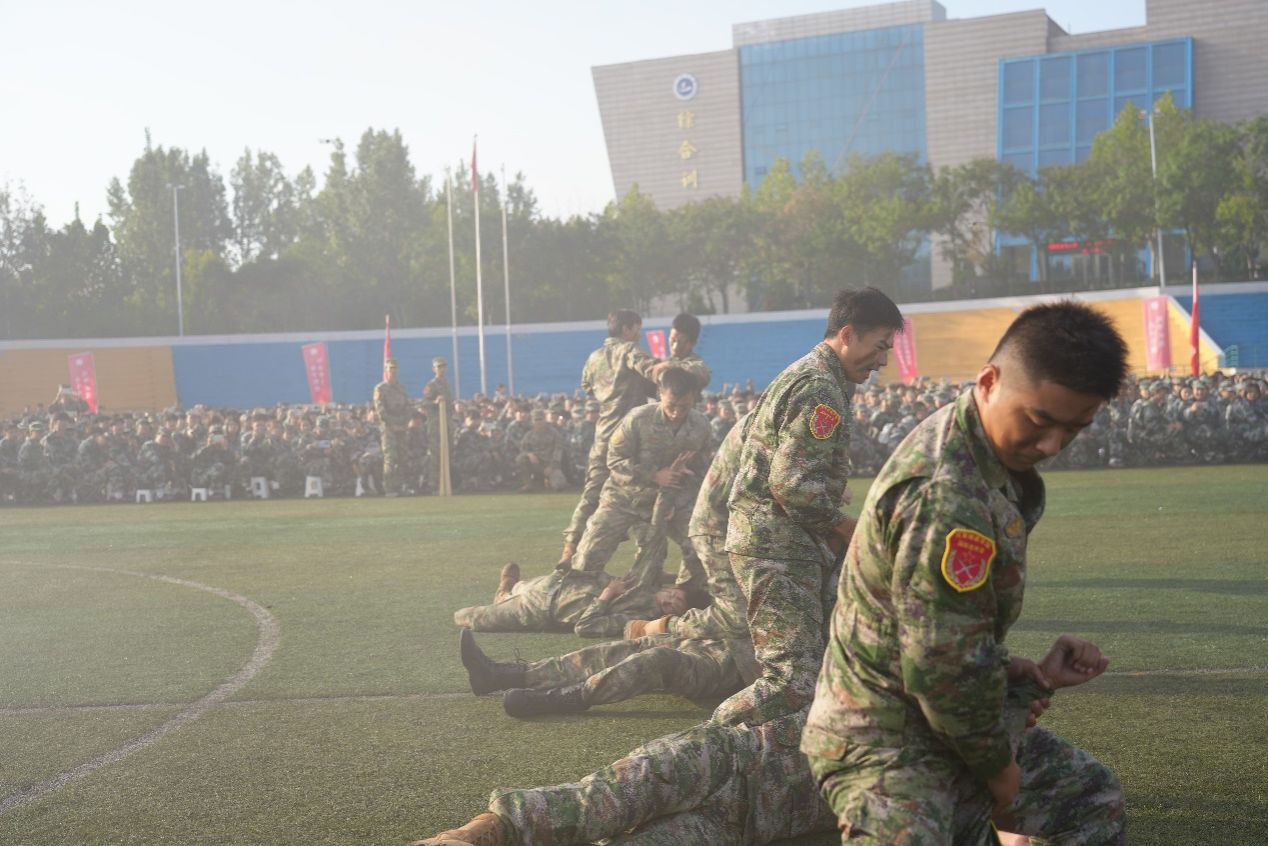 在军训总结表彰环节,大一新生进行了刺杀操、擒敌拳、匕首操、战术等汇报演示,同学们以昂扬的斗志、蓬勃的朝气向学校领导和老师展示了21天的军训成果。