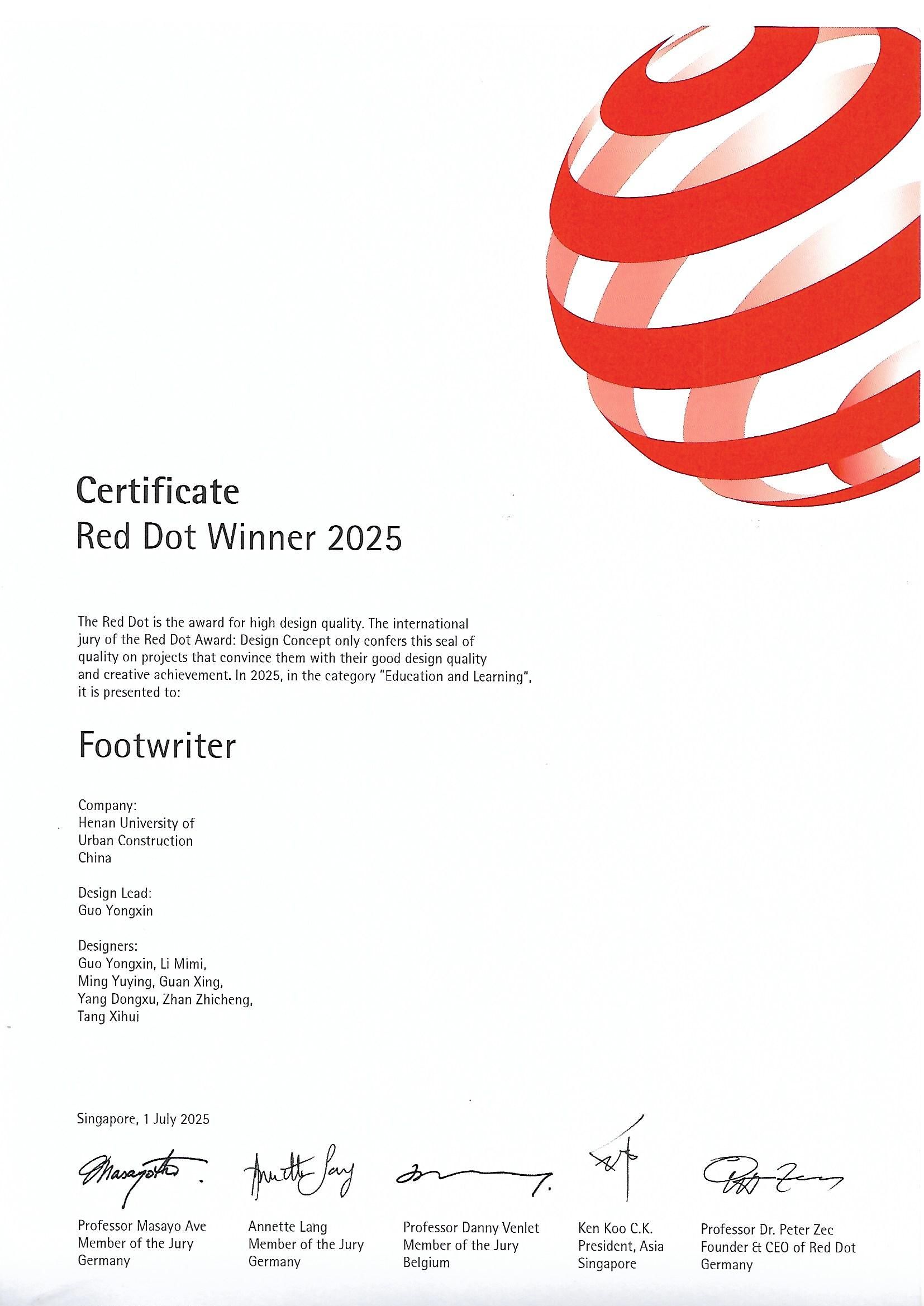 2025年10月15日,备受全球设计界瞩目的德国红点设计概念奖(Red Dot Award: Design Concept)颁奖典礼在新加坡举行。由我校艺术设计学院师生团队(成员包括郭永欣、明玉盈等)设计的作品《Foot writer》,以其独特的设计理念与卓越的视觉呈现,从全球数万件参赛作品中脱颖而出,成功斩获本年度红点设计奖。这是艺术设计学院继2019年、2021年之后,第三次摘得此项国际顶级设计殊荣,生动展现了艺术设计学院在党建引领下,深耕设计教育、践行立德树人根本任务的丰硕成果。