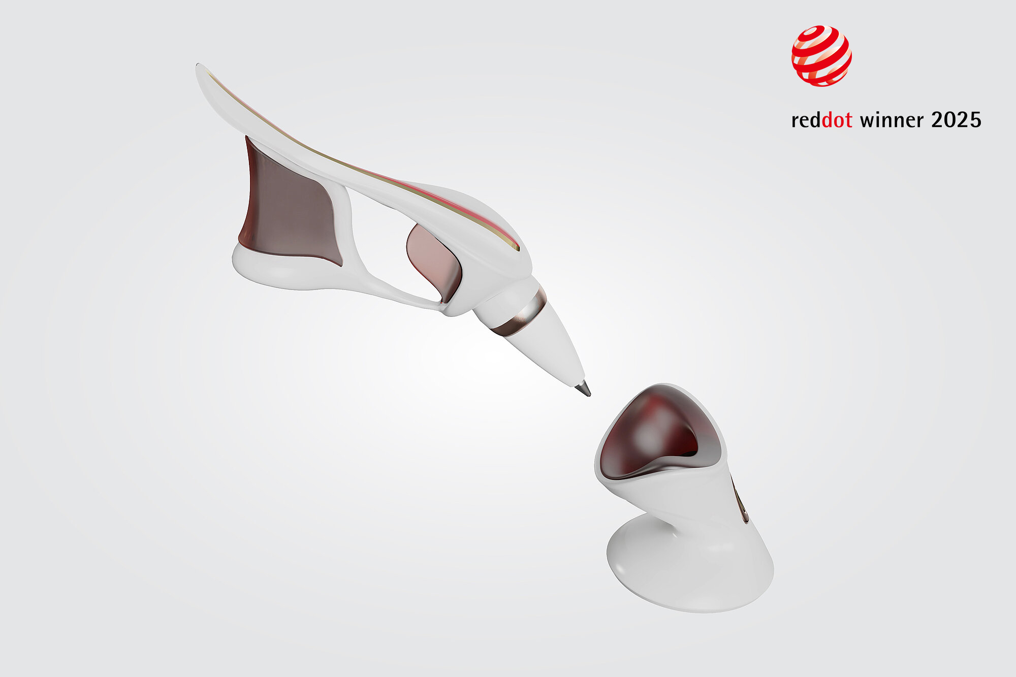 我校获奖作品《Foot writer》聚焦没有手臂的特殊人群的书写问题,创新了用笔写字的方式。它能够提供一种自然且舒适的足部书写姿势,精心设计的笔身形状确保在书写时保持清晰的视线,同时高品质的硅胶握把则减少了摩擦带来的不适感。此外,笔帽以45度的角度倾斜放置,并配有磁性附件,更方便取用。《Foot writer》凭借对无障碍需求的深度响应与突破性设计探索,最终赢得全球评审团的高度认可,成为我院设计成果服务特殊群体的典型代表。