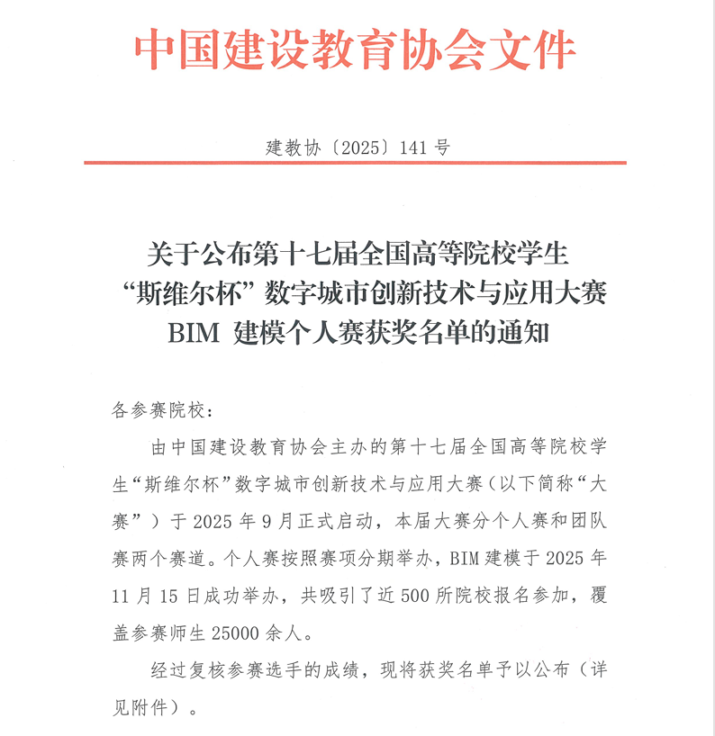 近日,由中国建设教育协会主办的第十七届全国高等院校学生“斯维尔杯”数字城市创新技术与应用大赛圆满落幕。我校管理学院城建BIM 竞技社学子凭借扎实的专业功底、创新的技术应用与默契的团队协作,在全国众多参赛队伍中脱颖而出,一举斩获30项奖项,充分彰显了我校在BIM技术人才培养领域的深厚积淀与显著成效。