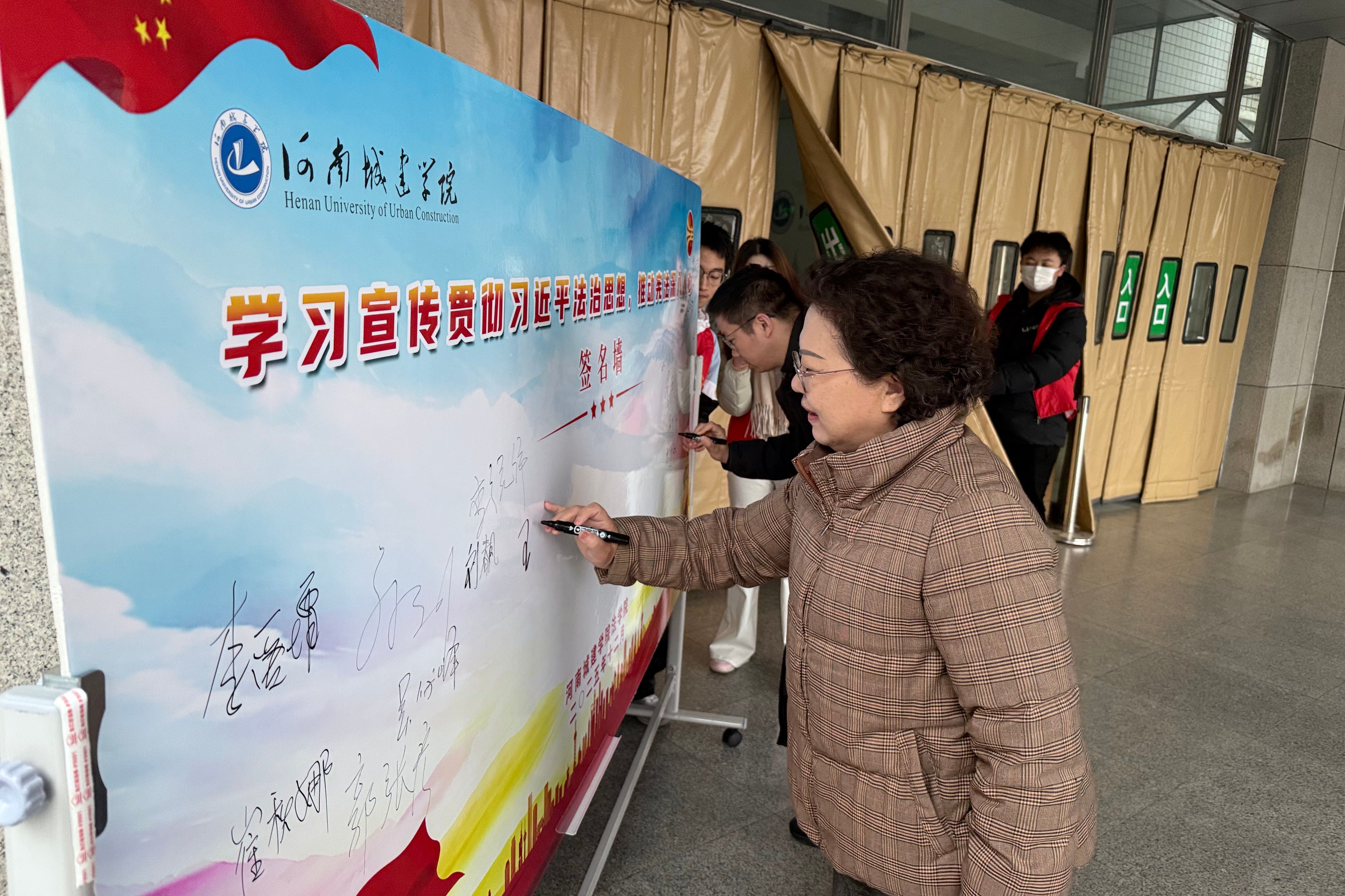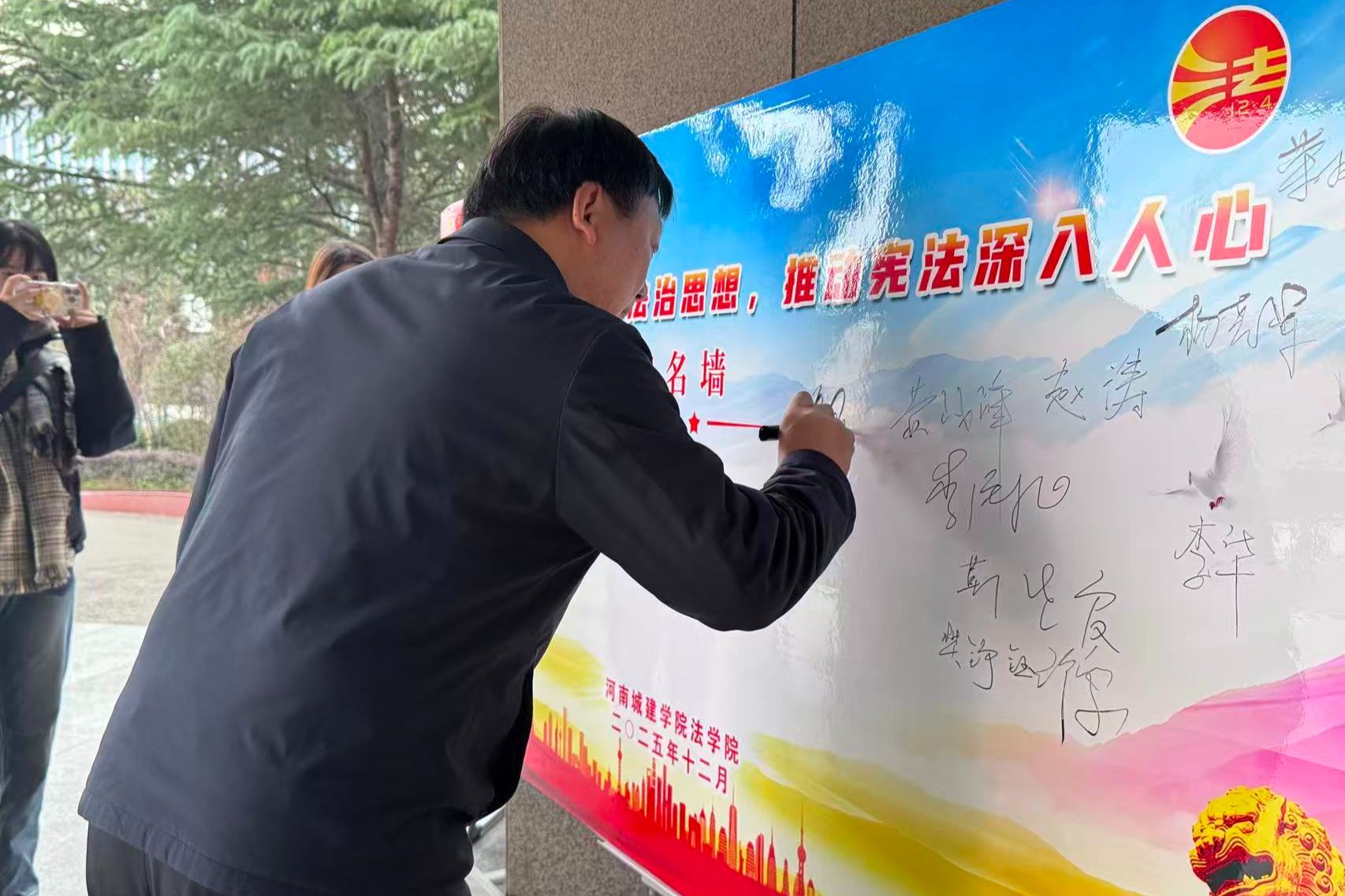 在主题签名墙前,师生郑重签上自己的姓名,以行动和决心表达要自觉维护宪法的权威,争做宪法维护者。