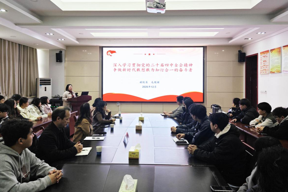 12月19日下午,副校长毛艳丽在9A315会议室以《深入学习贯彻党的二十届四中全会精神,争做新时代敢想敢为知行合一的奋斗者》为题,为市政与环境工程学院、材料与化工学院全体研究生和教师代表讲授思想政治理论课。