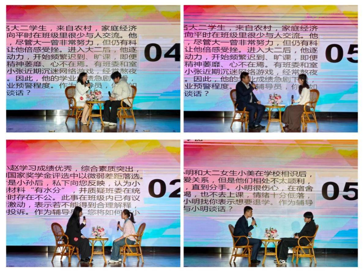 12月23日,大赛总决赛在行政楼学术报告厅举行,13名辅导员凭借出色表现进入总决赛。总决赛以“谈心谈话”情景模拟为主线,聚焦学业规划、心理疏导、生涯发展等真实学生工作场景,生动展现辅导员把握学生成长规律、有效沟通疏导、解决实际问题的专业能力。现场互动深入,气氛热烈,充分彰显了辅导员队伍的职业风采与育人担当。
