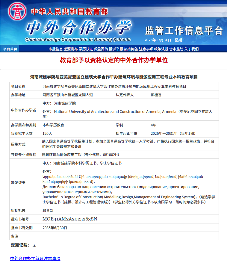 近日,教育部公布了2025年下半年中外合作办学项目审批结果,我校与亚美尼亚国立建筑大学合作举办的建筑环境与能源应用工程专业本科教育项目成功获批,标志着我校国际化办学取得新突破。