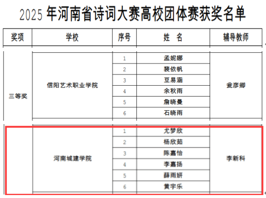 近日,河南省教育厅发布2025年河南省诗词大赛获奖名单(教社语〔2025〕262号),我校学子表现优异,荣获大学生组个人赛二等奖2项、团体赛三等奖1项。