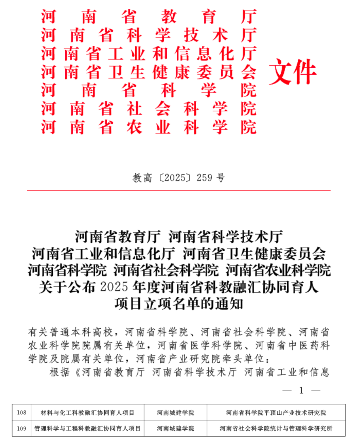 近日,河南省教育厅、河南省科技厅等七部门联合印发《关于公布2025年度河南省科教融汇协同育人项目立项名单的通知》(教高〔2025〕259号),我校申报的2项科教融汇协同育人项目均成功获批。其中,“材料与化工科教融汇协同育人项目”与河南省科学院平顶山产业技术研究院携手共建,“管理科学与工程科教融汇协同育人项目”与河南省社会科学院统计与管理科学研究所共同合作,2项成果的落地标志着学校在深化科教融汇实践、推动教育科技人才一体化发展进程中取得关键性突破,为提升应用型人才培养质量注入强劲新动能。