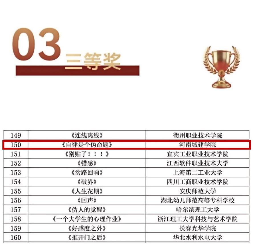 近日,由全球文化教育交流委员会、国际心理委员与朋辈支持联盟联合主办的第五届全国高校心理微电影(心理短视频)优秀作品展示活动获奖名单正式公布。我校大学生心理健康中心报送的心理微电影《自律是个伪命题》荣获三等奖,该作品由建筑与城市规划学院刘花培老师指导,许益纶等同学联合创作。作品以大学生自律困惑为切入点,讲述主人公摆脱内耗、突破自我的成长故事,贴近学生生活,传递积极心理调适理念,引发广泛共鸣。