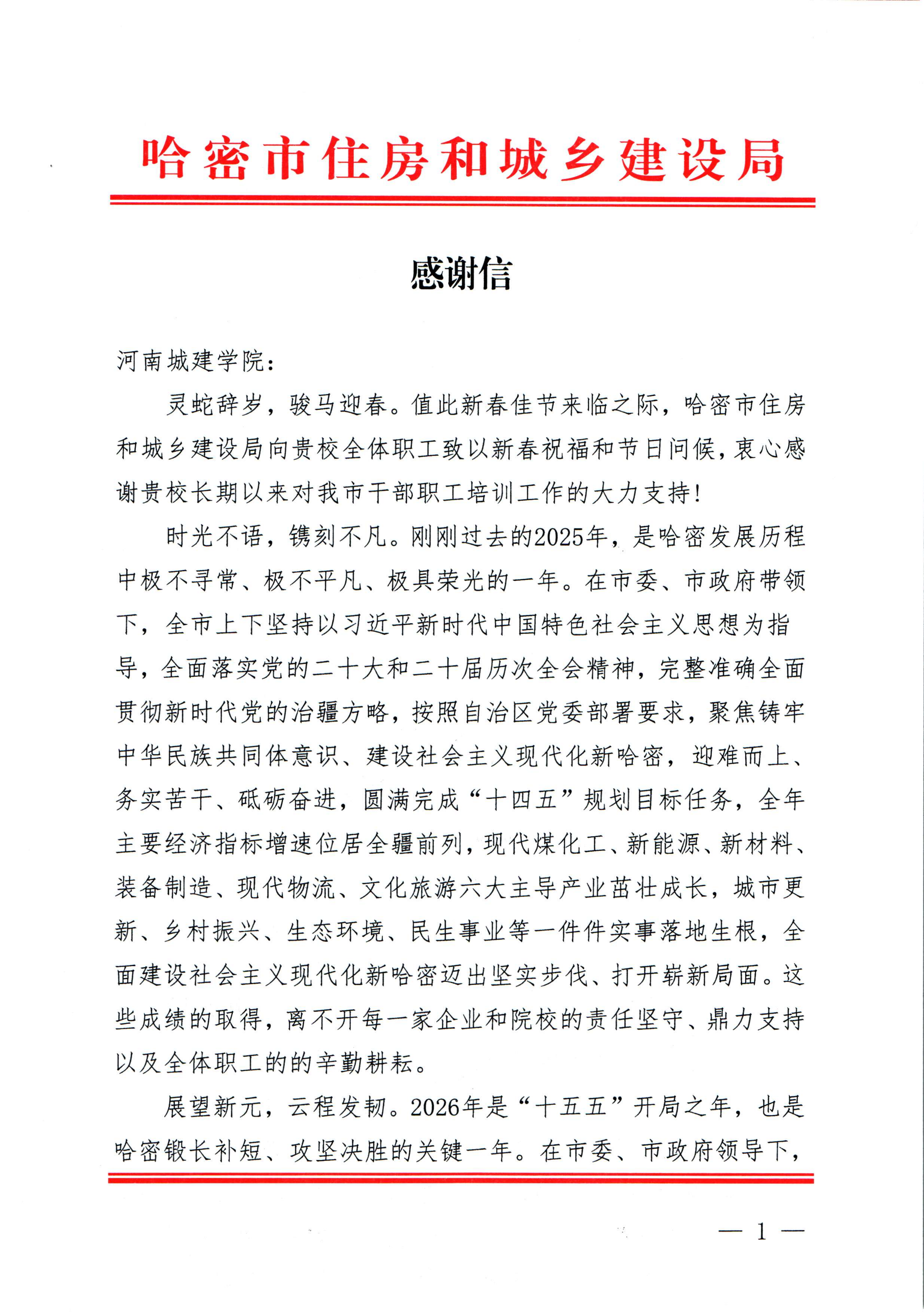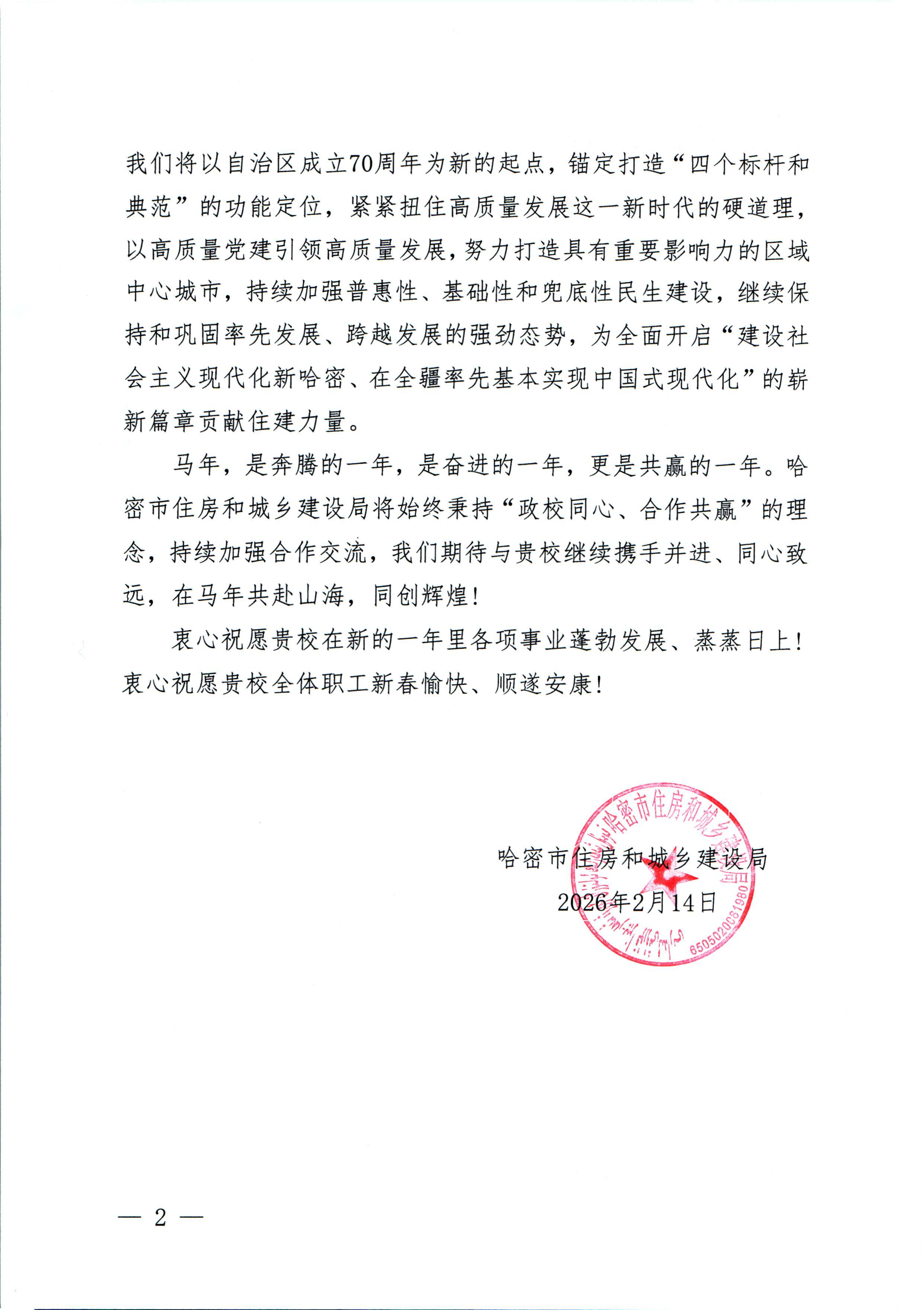 感谢信中指出,2025 年哈密市在各项发展建设中取得亮眼成绩,现代煤化工、新能源等六大主导产业蓬勃发展,城市更新、乡村振兴等民生实事落地生根,这些成绩的取得离不开我校的责任坚守与鼎力支持。信中还展望了 2026 年发展蓝图,称 2026 年是哈密 “十五五” 规划开局之年,也是锻长补短、攻坚决胜的关键一年,哈密市住房和城乡建设局将秉持 “政校同心、合作共赢” 理念,期待与我校继续携手并进、同心致远,在新的一年共赴山海、同创辉煌。