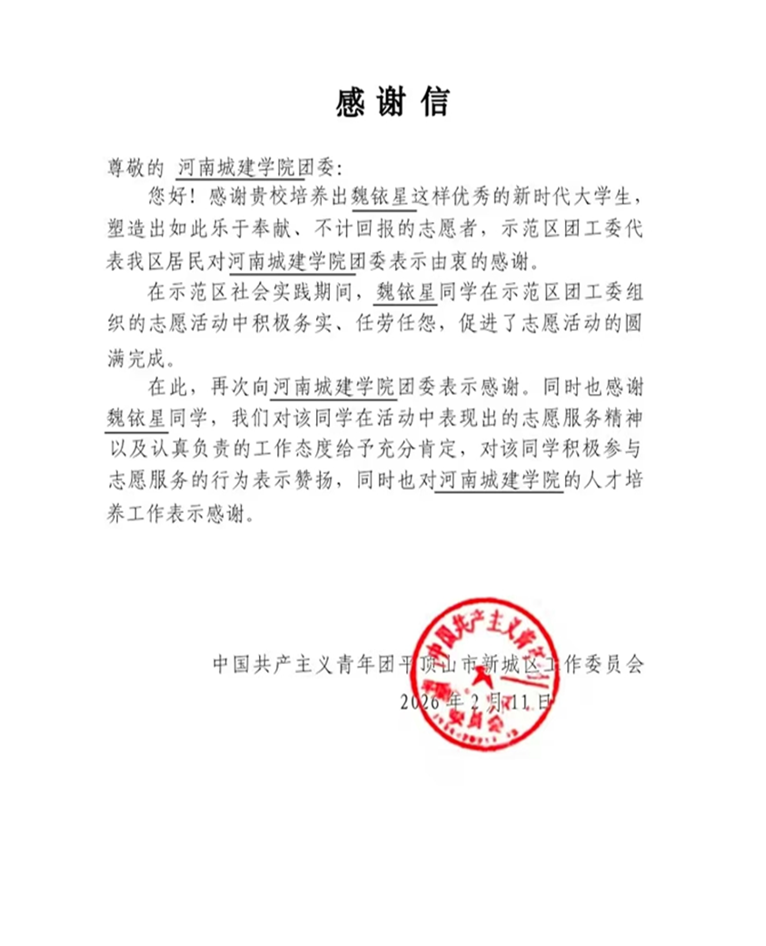 为深入学习贯彻习近平新时代中国特色社会主义思想,全面贯彻习近平总书记关于青年工作的重要论述,进一步动员引领青年学生在投身基层建设、服务家乡发展中受教育、长才干、作贡献,沉浸式感受新时代伟大变革的磅礴实践,把思政教育“小课堂”和社会“大课堂”有效融合起来,按照中共河南省委教育工委、河南省教育厅开展“牢记嘱托践使命 行走中原看巨变”主题思政教育实践活动的部署要求,2026年寒假,校团委聚焦立德树人根本任务,以“青春为中国式现代化挺膺担当”主题,精心组织2026年寒假大学生“返家乡”社会实践,推动青年学子走出校园、扎根基层,持续为家乡发展注入源源不断的青春动能。
