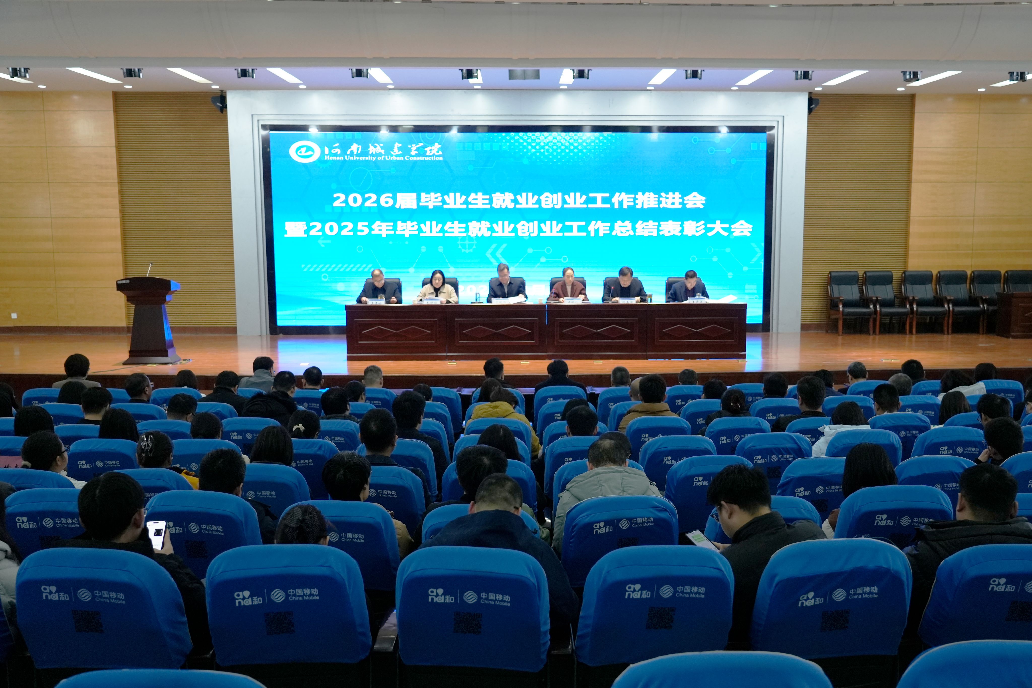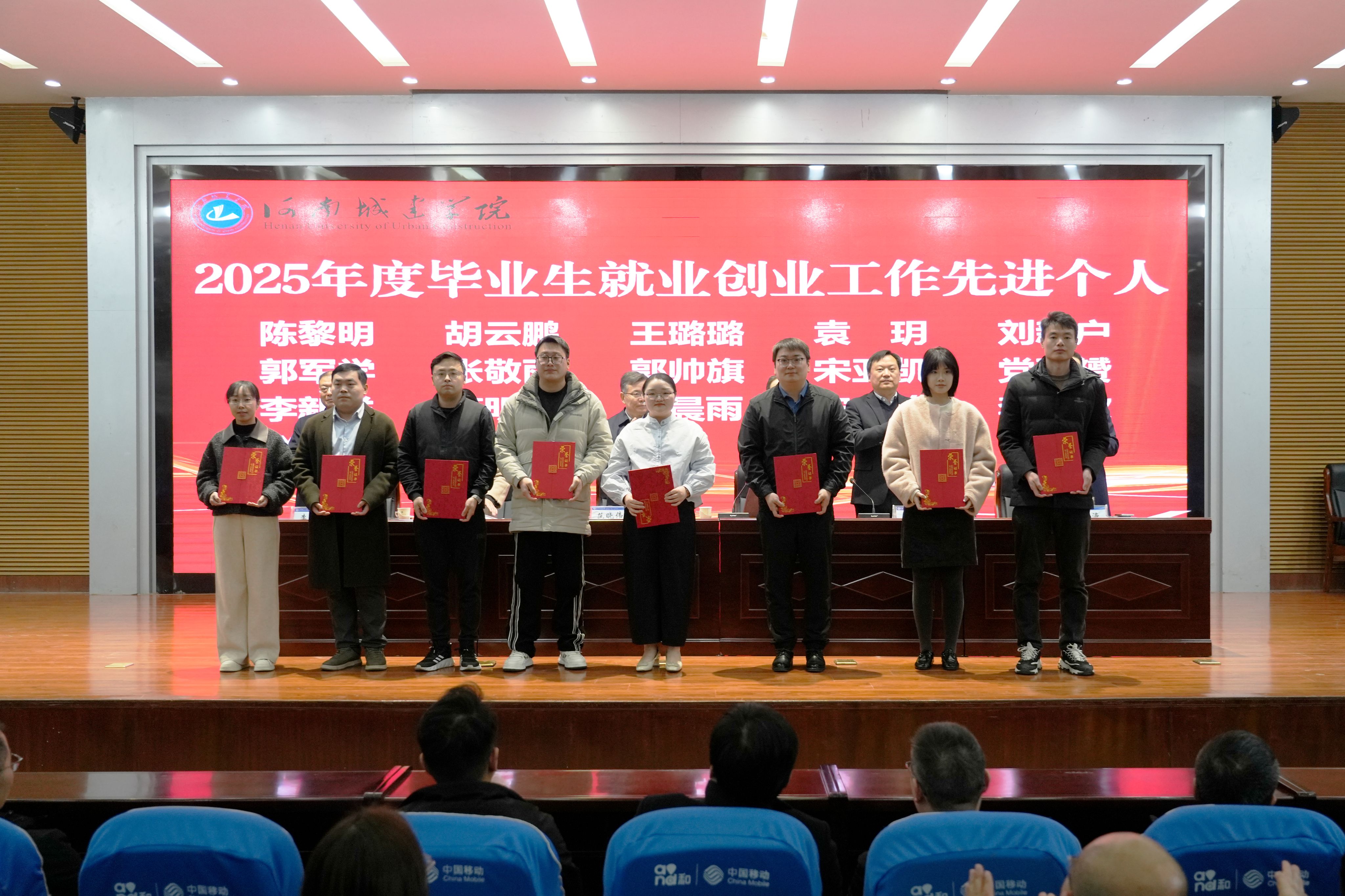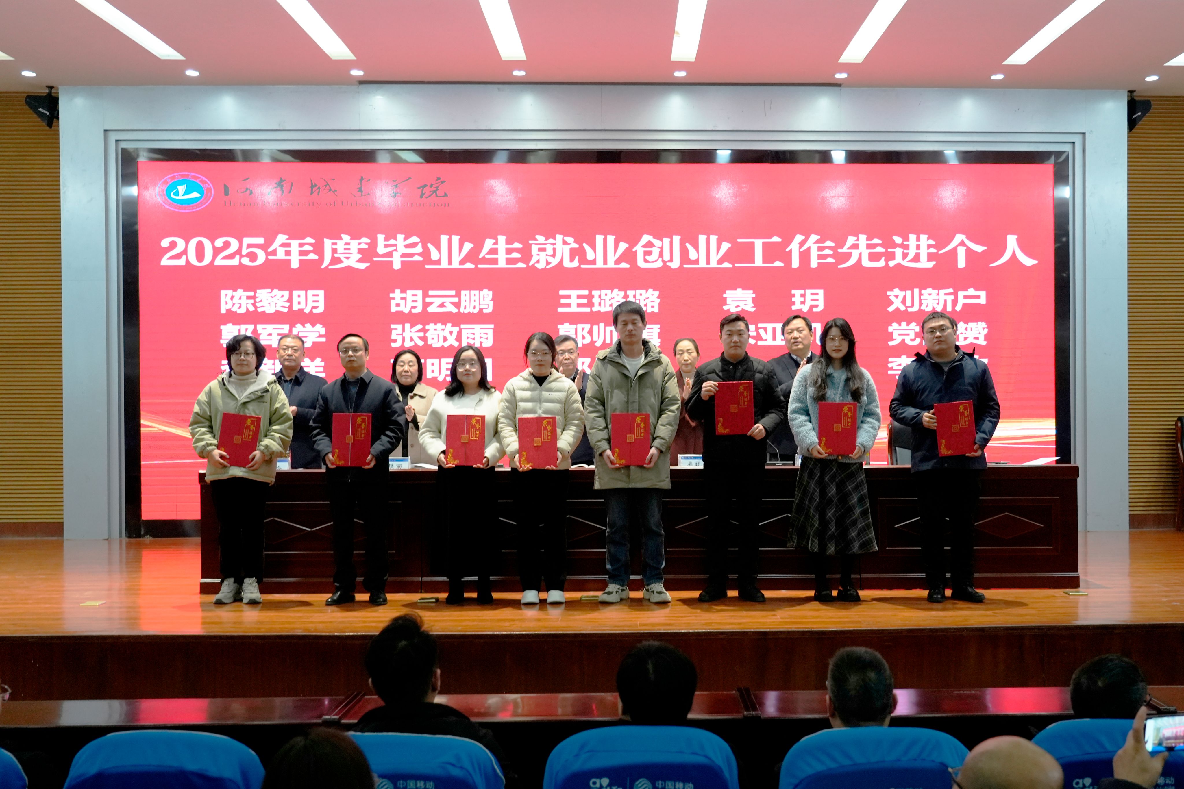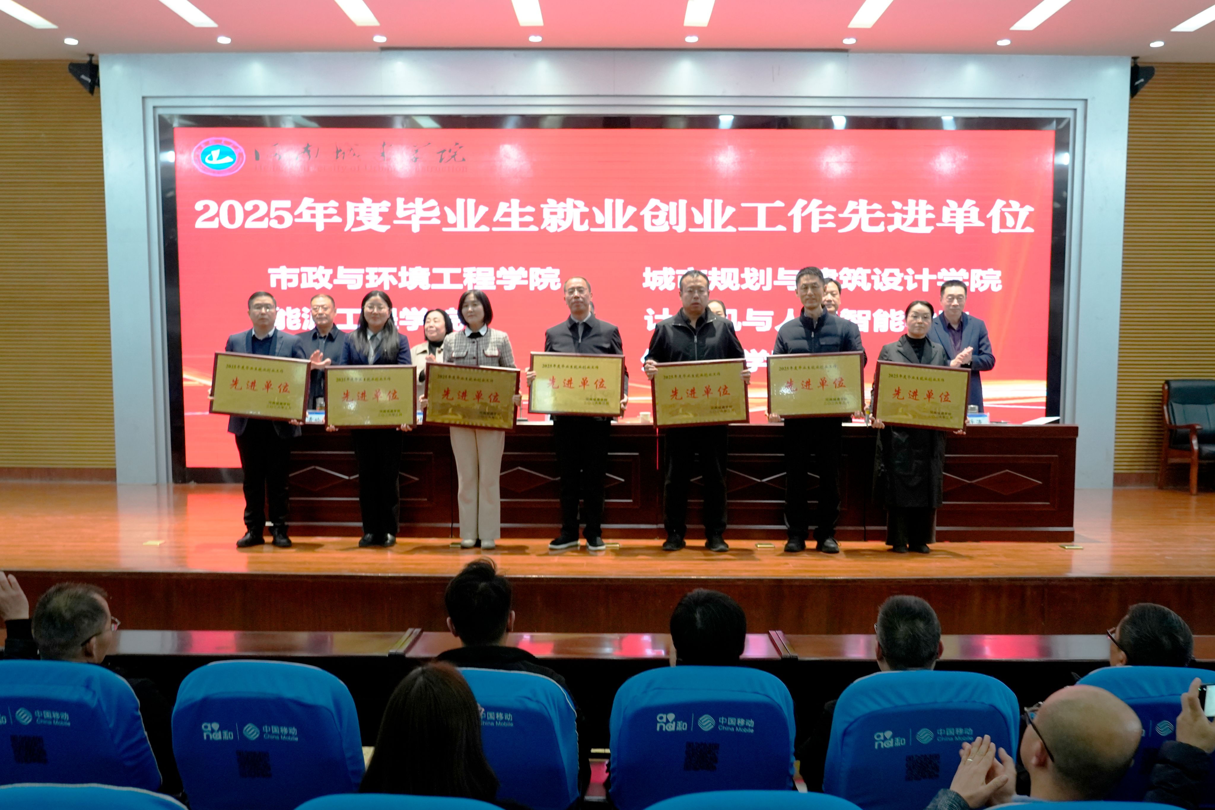 会上,吴晓红对2026届毕业生就业推进工作提出三点要求:一是高度重视,加强组织领导;二是加强宣传,营造良好氛围;三是健全机制,形成育人合力。孙玉周宣读了《河南城建学院关于表彰2025年度毕业生就业创业工作先进单位和先进个人的决定》,就业创业指导中心负责人宣读了《河南城建学院2026届毕业生就业创业工作实施方案》。大会对市政与环境工程学院、城市规划与建筑设计学院、能源工程学院、计算机与人工智能学院、材料与化工学院、外国语学院、法学院7个就业创业工作先进单位和陈黎明等16名就业创业工作先进个人进行了表彰。