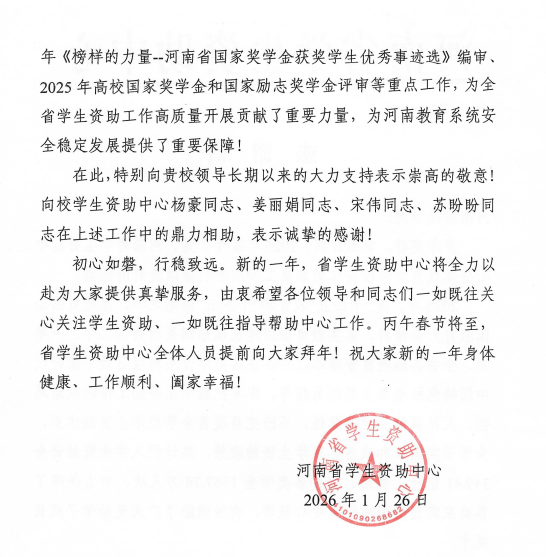 近日,我校收到河南省学生资助中心发来的感谢信。来信对学校在学生资助工作方面的高度重视与大力支持表示感谢,并对学校为全省资助工作高质量开展所作出的贡献提出表扬。