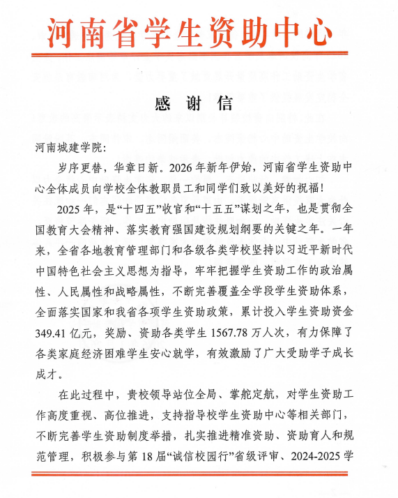 信中指出,河南城建学院校领导站位全局、掌舵定航,对学生资助工作高度重视、高位推进,支持指导校学生资助中心等相关部门,不断完善学生资助制度举措,扎实推进精准资助、资助育人和规范管理,积极参与第18届“诚信校园行”省级评审、2024-2025学年《榜样的力量--河南省国家奖学金获奖学生优秀事迹选》编审、2025 年高校国家奖学金和国家励志奖学金评审等重点工作,为全省学生资助工作高质量开展贡献了重要力量,为河南教育系统安全稳定发展提供了重要保障。