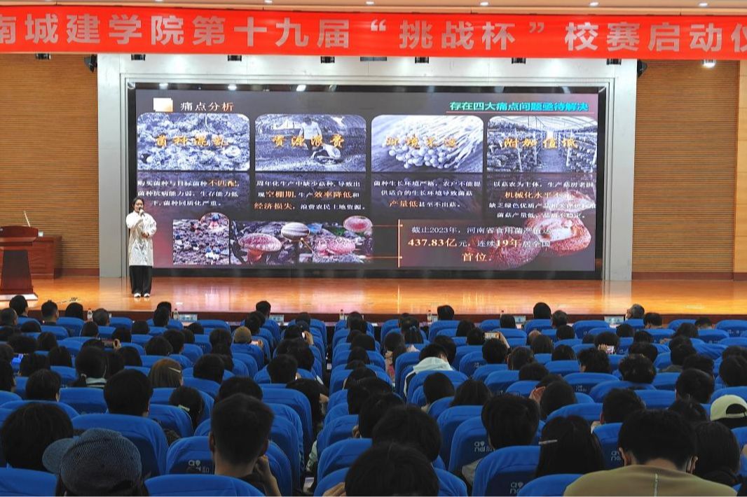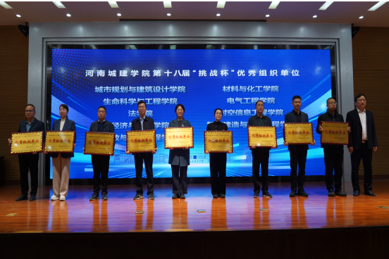 腾飞汇报了我校第十八届 “挑战杯” 竞赛工作成果并宣读了第十九届“挑战杯”工作安排。仪式现场,孙玉周为城市规划与建筑设计学院、材料与化工学院等9个第十八届 “挑战杯”优秀组织单位颁奖。2024年生命科学与工程学院“挑战杯”国赛三等奖项目《“非同蕈常”— 蘑菇功能性育种领航者》、2025年城市规划与建筑设计学院“挑战杯”省赛特等奖项目《“新旧相推,日生不滞”——郏县传统村落保护利用调研与发展策划》依次进行展示,优秀团队分享备赛经验与实践成果,为在场团队提供宝贵借鉴。仪式最后,孙玉周与职能部门领导共同点亮启动屏,正式宣布河南城建学院第十九届 “挑战杯” 校赛启动。