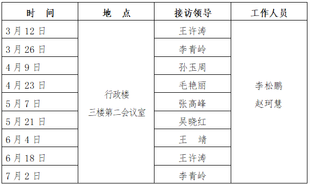 学校党政领导轮流在接待日值班接待来访师生。原则上,来访事项以接待领导分工为限。若遇当日值班领导出差,视情况予以调整。
