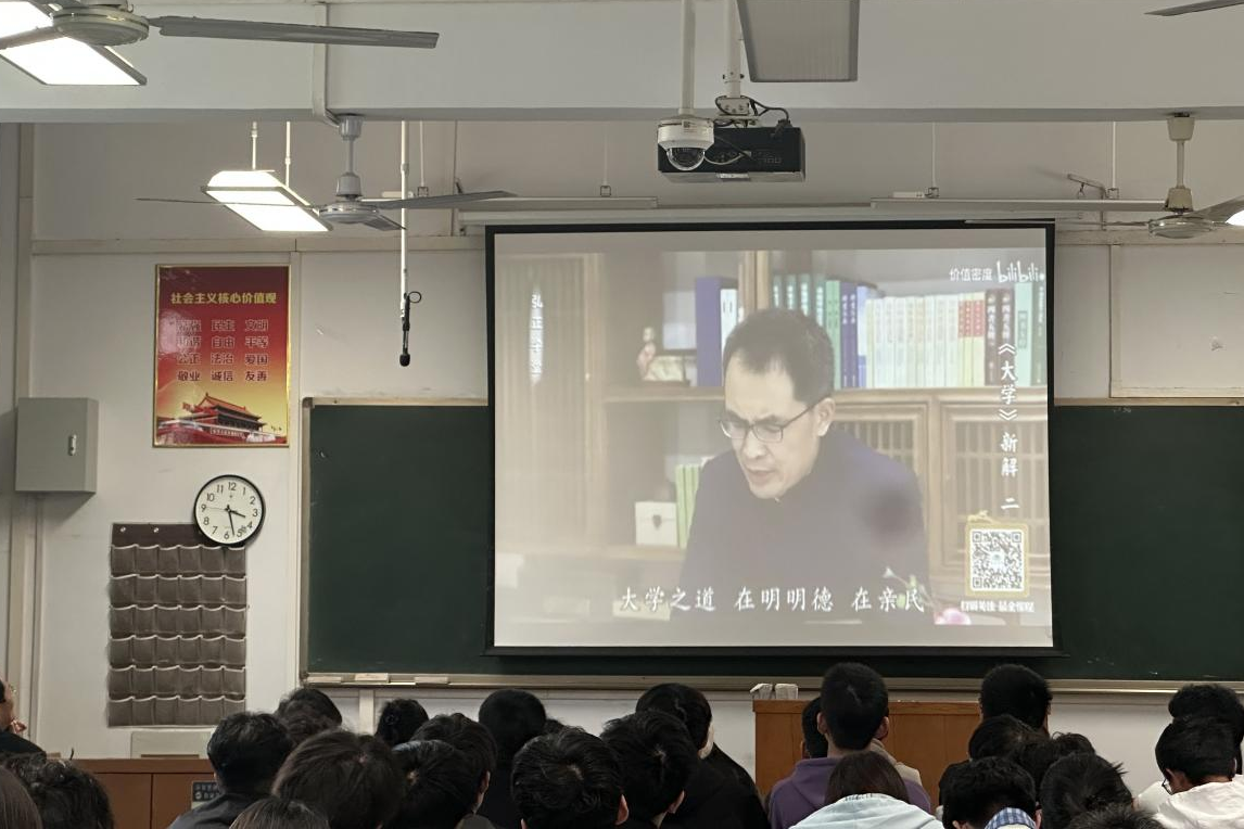 随后,全体与会师生共同认真观看了中国政法大学副教授郭继承老师的专题视频报告。郭继承副教授在报告中,以其深厚的学术功底和深入浅出的讲解方式,对儒家经典《大学》的核心理念进行了精辟阐释。通过视频学习,师生们明晰了“三纲”——“明明德、亲民、止于至善”作为人生追求的崇高目标,即弘扬光明品德,推己及人使人更新,最终达到最完善的境界。进而,大家对实现“三纲”的实践路径“八目”——“格物、致知、诚意、正心、修身、齐家、治国、平天下”有了更为深刻的理解。从探究事理、获取真知,到端正意念、纯化内心,最终完成自身修养,并扩展到家庭、国家乃至天下,这一由内而外、环环相扣的修身与成功逻辑链条,引发了在场师生的深深思考与共鸣。