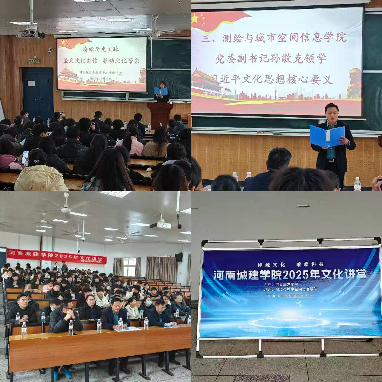 为深入贯彻习近平文化思想,落实教育部“礼敬中华优秀传统文化”宣传教育活动要求。近日,由校文明办主办、测绘与城市空间信息学院承办的河南城建学院第十期文化讲堂活动在5号楼C314音乐教室举行。测绘与城市空间信息学院党委书记武伯军、党委副书记孙敬克、副院长杨锋以及全体教师和学生代表参与了本次活动。