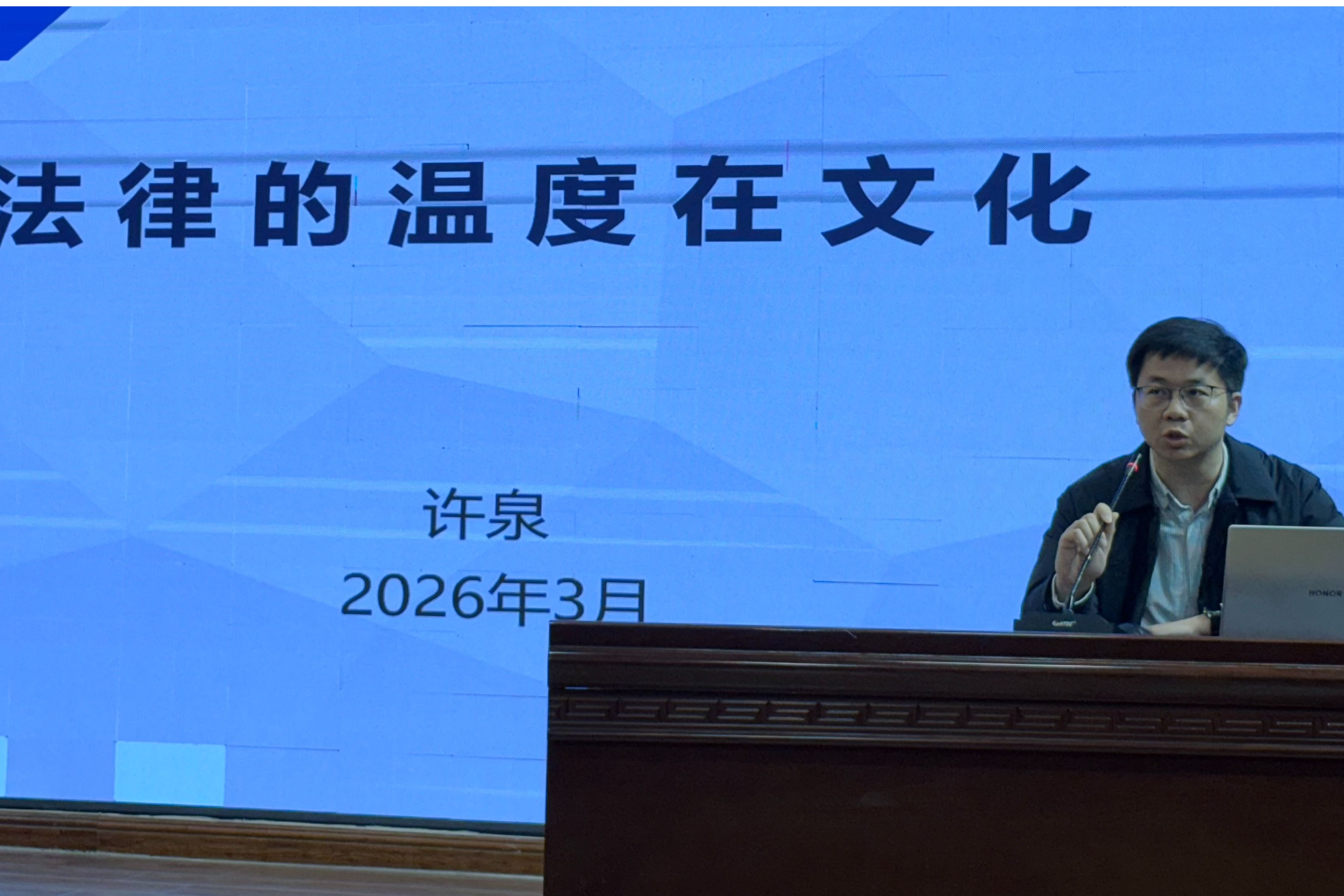 3月26日,由校精神文明办主办、法学院承办的2026年第一期文化讲堂在建德楼会议教室顺利举办。本次讲堂以“法律的温度在文化”为主题,邀请法学院党委副书记许泉主讲,法学院24级全体学生到场聆听学习。