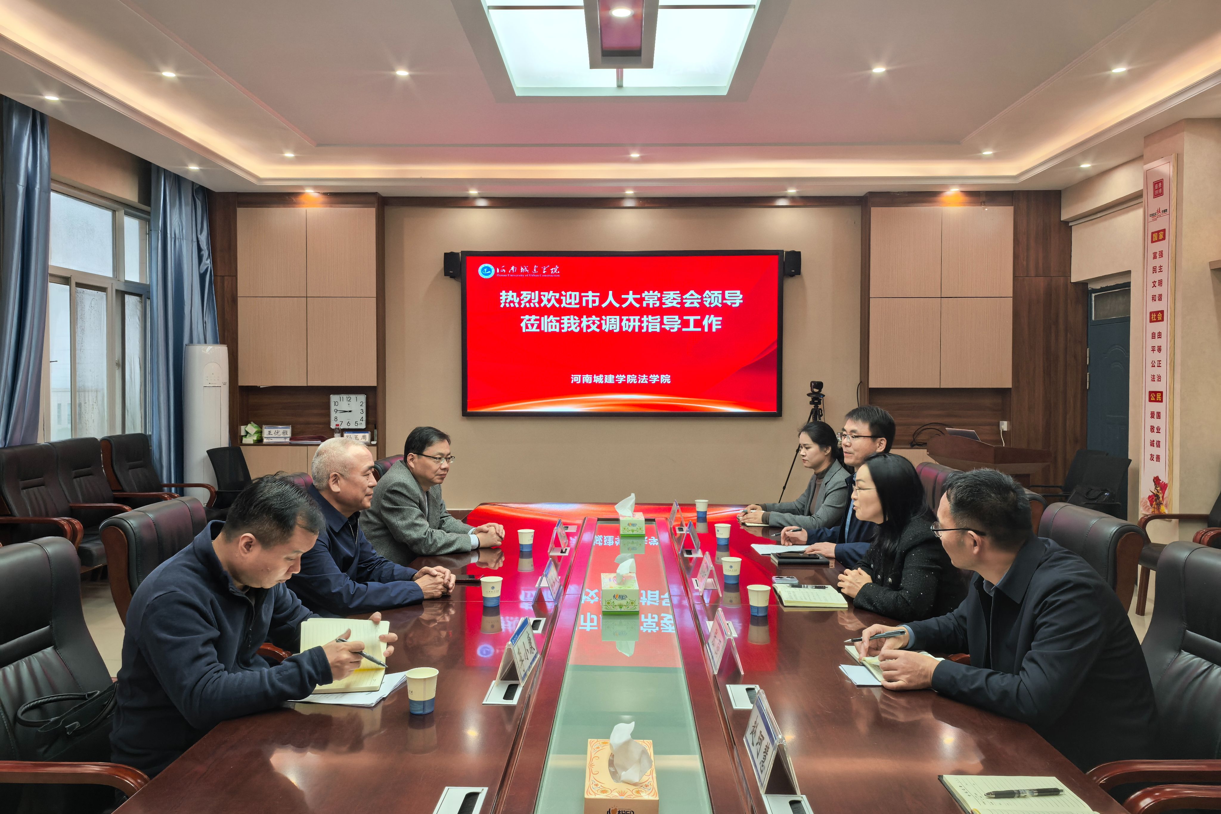 10月16日上午,平顶山市人大常委会副主任马军义率队到我校调研立法联系点工作,市人大常委会法工委主任郭杰、市人大常委会法工委立法科科长李小康等陪同调研,法学院副院长马东丽、张强、党委副书记吴锦展及相关教师代表参加会议。会议由马东丽主持。