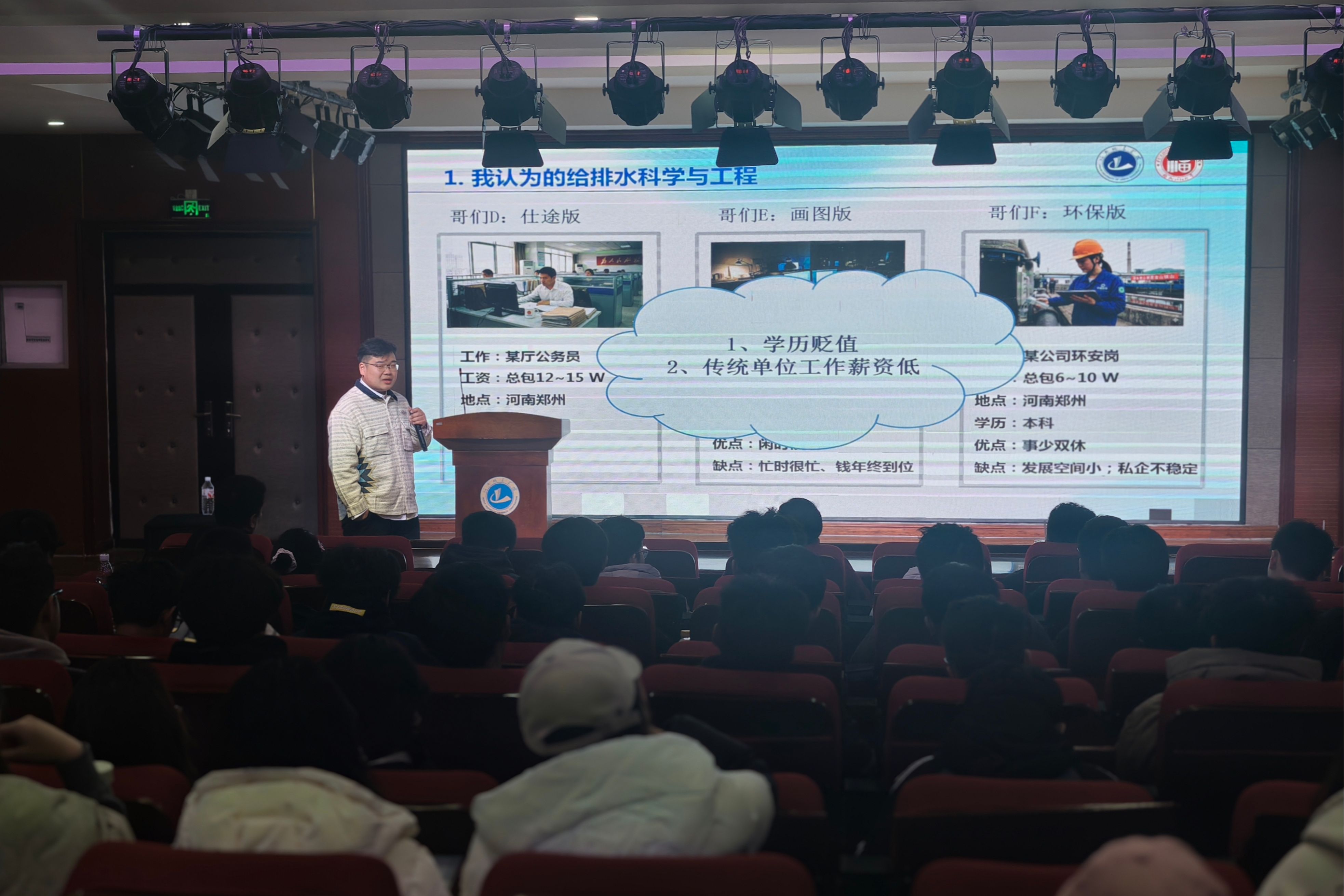 曹泰洋以对给排水专业的理解为出发点,与同学们分享了读博读研期间的课程学习、日常生活及科研经历,鼓励同学们顺应时代浪潮、珍惜当下时光、广泛拓展视野,在探寻个人兴趣方向中增强核心竞争力,始终保持积极心态,勇于探索尝试、书写青春华章。刘诗浩则结合在校期间的社团经历与社会实践经验,建议同学们尽早明确个人发展目标,以目标为导向制定科学规划,在持续提升综合素养的过程中,为未来的就业升学之路筑牢坚实基础。在互动环节,同学们热情满满,踊跃提问,两位嘉宾结合自己的经验就就业与升学的选择等问题逐一作了解答。