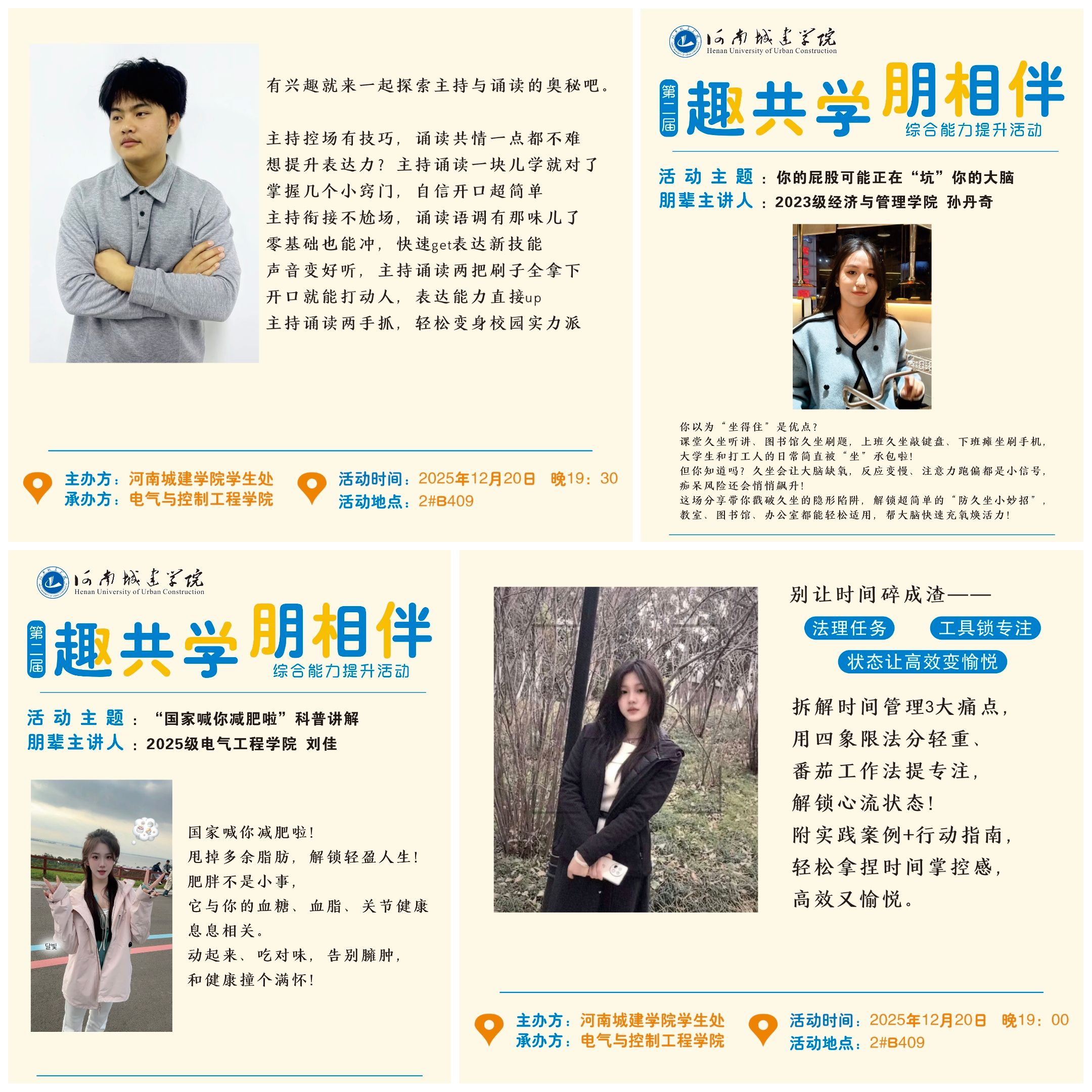 为构建多元化学生发展服务体系,搭建优质朋辈互动平台,精准破解学生成长过程中“自信心不足”“表达力薄弱”“视野不够开阔”等痛点难题,自2025年11月下旬,学校开展了为期一个月的第二届“趣共学 朋相伴”综合能力提升活动,本次活动由学生处主办,电气工程学院承办,累计吸引近1000名学生参与。