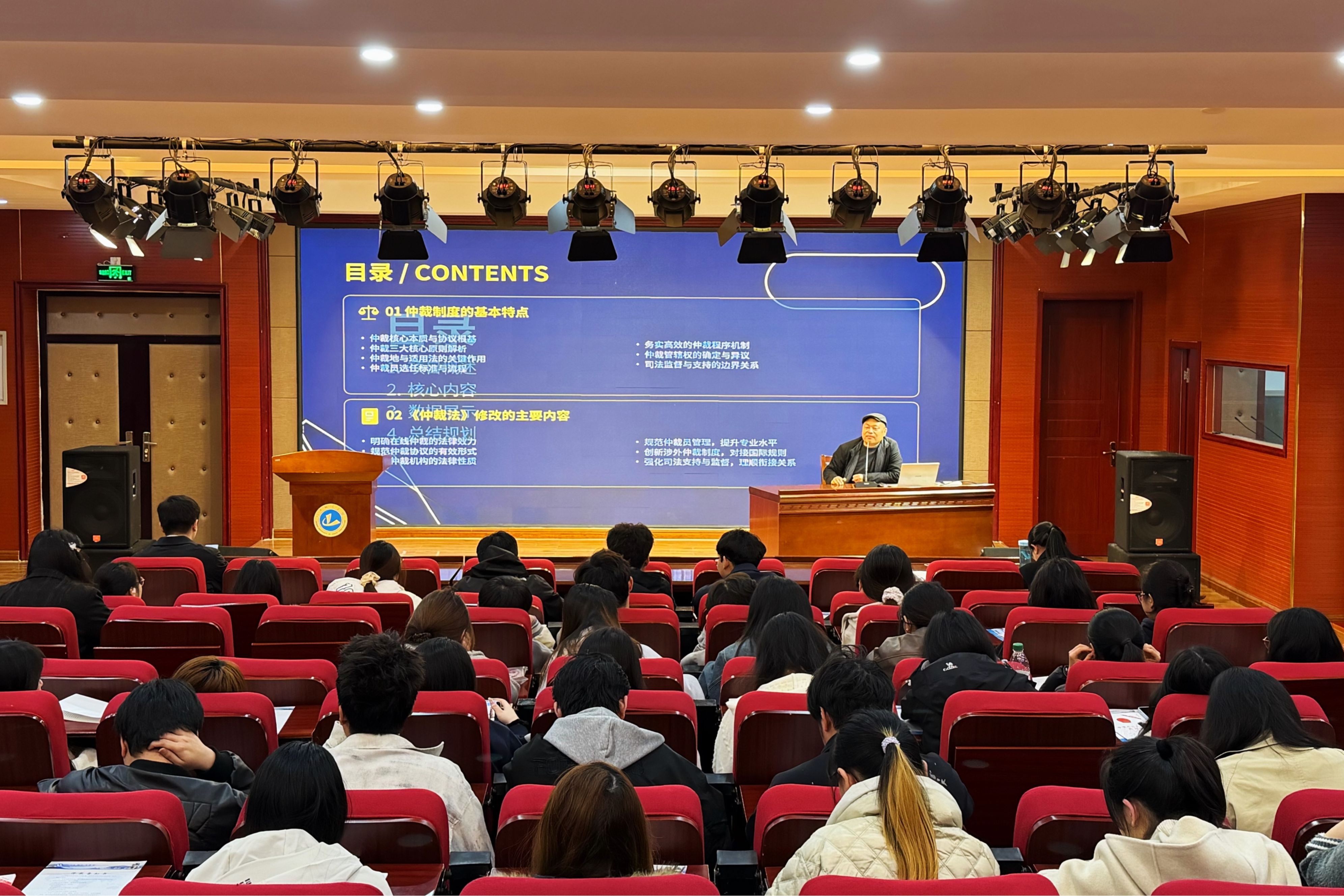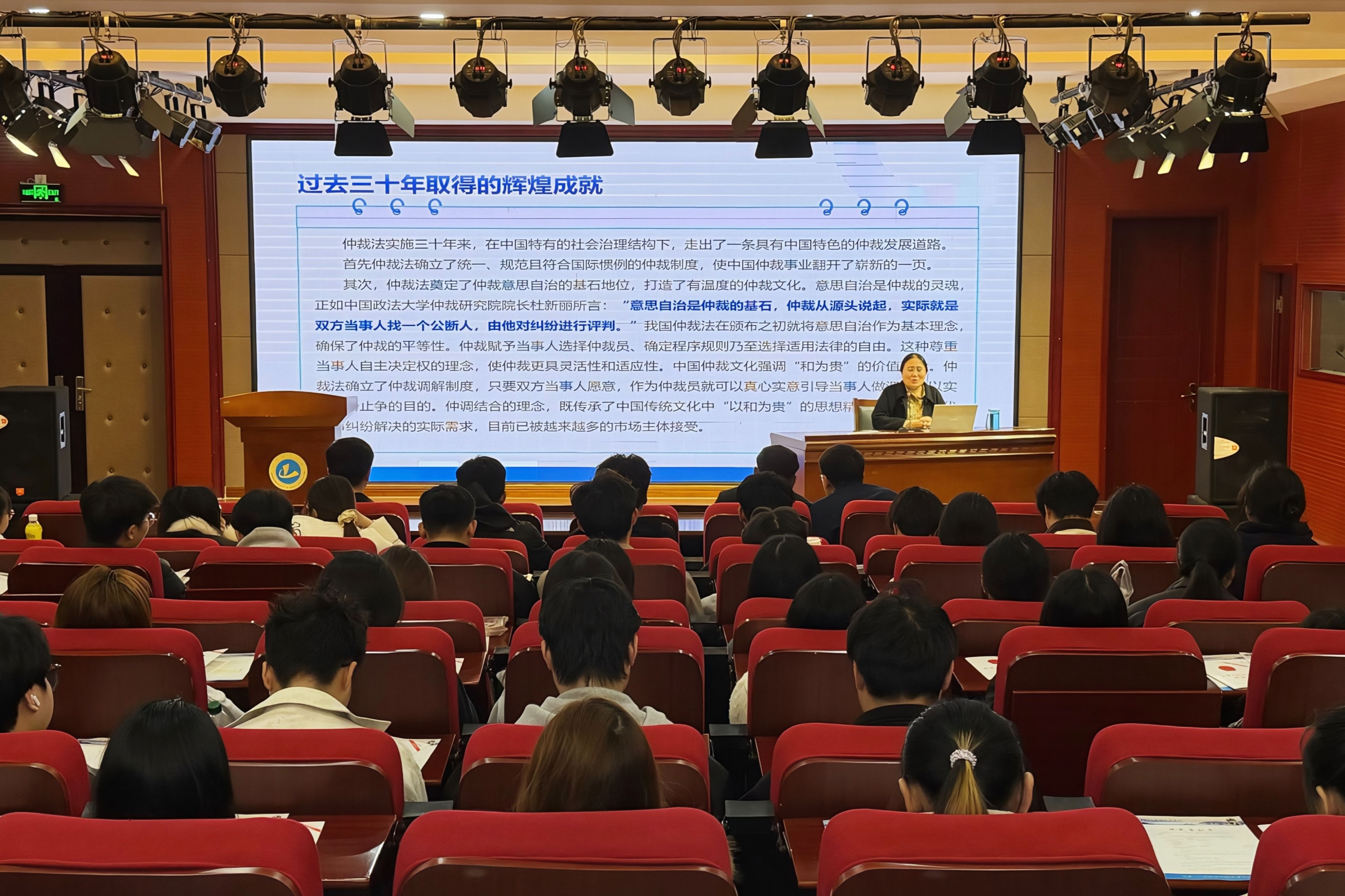 赵红敏科长以《仲裁事业发展概况及前景展望》为题,系统回顾了我国仲裁制度三十年来的发展历程与丰硕成果,详细讲解了仲裁行业对大学生就业的助力作用,以及仲裁相关知识对今后从事法律实务工作的积极影响。讲座中,赵红敏结合“六尺巷”经典故事,深入阐释了中国仲裁文化“和为贵”的核心理念,点明仲裁调解制度既传承了中华优秀传统文化精髓,又契合现代民商事纠纷化解的实际需求。她强调,随着《仲裁法》修订完善,仲裁事业将在服务国家高质量发展、推进高水平对外开放进程中,发挥愈发重要的作用。