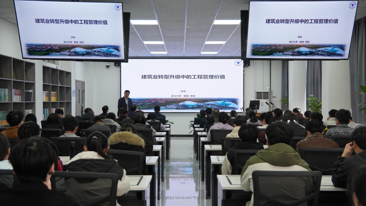 讲座中,张宏以《建筑业转型升级中的工程管理价值》为主题,结合前沿研究成果与行业发展趋势,系统解读建筑业数字化、智能化转型方向,深入阐释工程管理在行业升级中的核心作用与实践路径,分享工程管理智能优化决策、数字技术融合应用等前沿内容,为师生学术研究、专业学习与职业规划提供了权威指导。