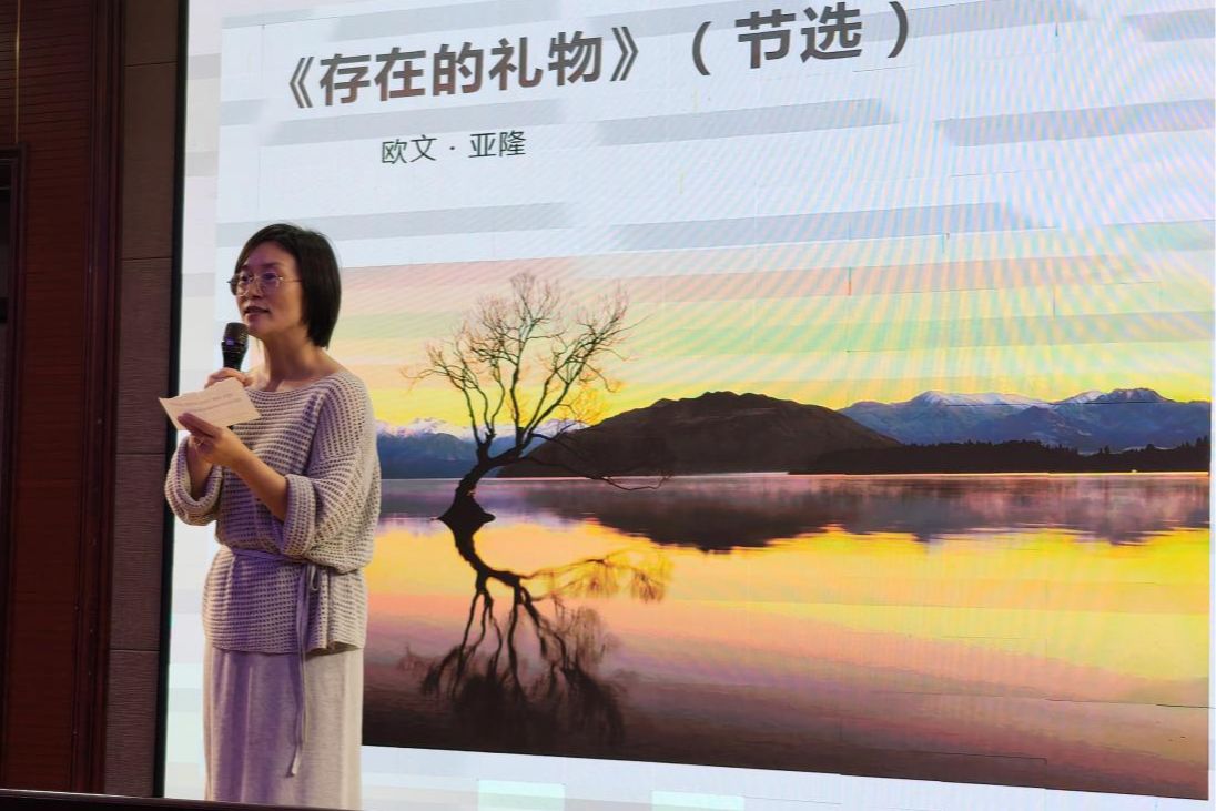 分享尾声,张冠琼老师带领全体师生共同朗读鲁米诗句《你不是问题本身》,以欧文・亚隆《存在的礼物》(节选)作结语,用文字温暖心灵、传递力量,激励大家接纳自我、向阳成长。