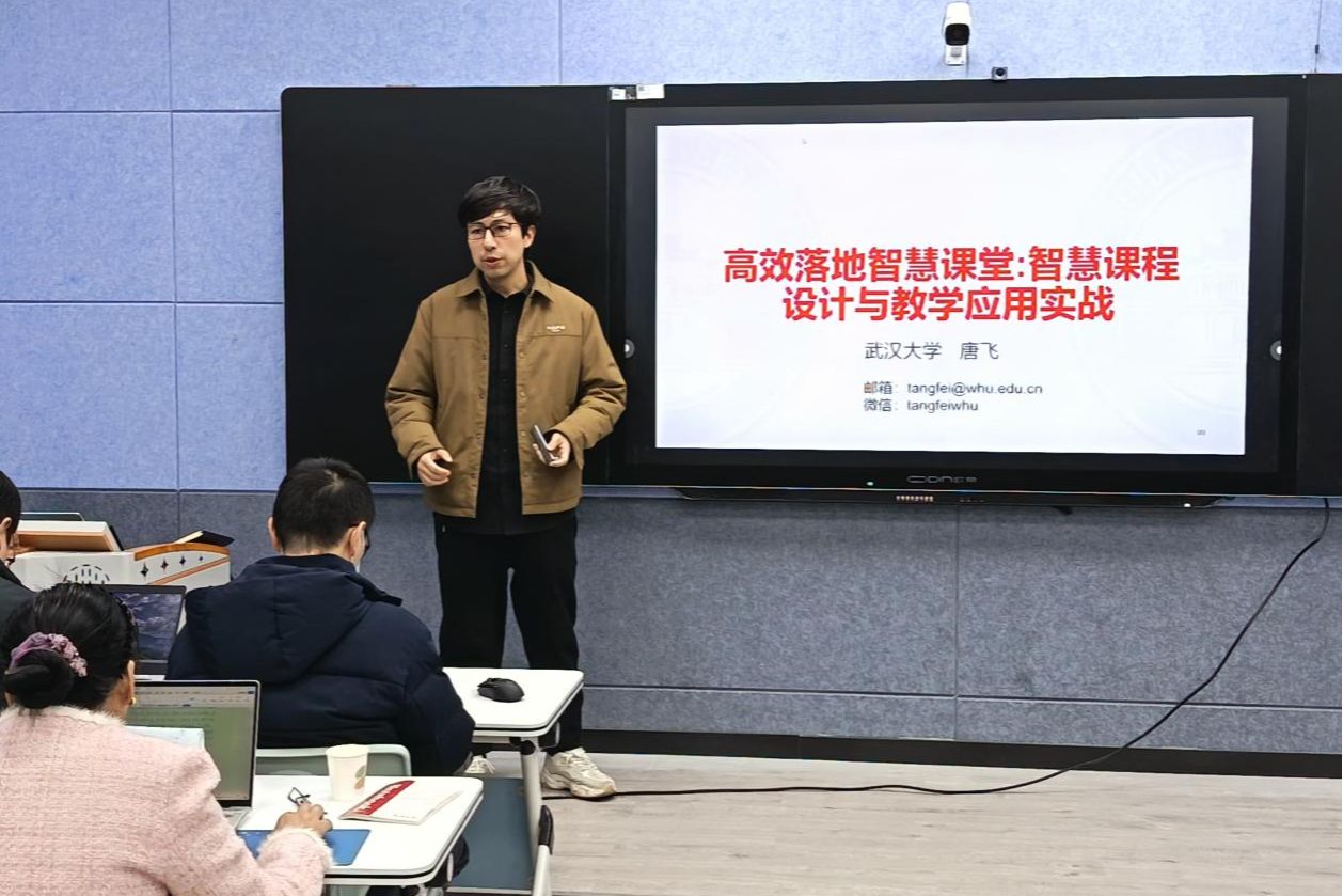 为了深化人工智能与教育教学的融合创新,探索智慧课程建设的有效路径,全面提升教师混合式教学设计与实施能力,12月16日上午,我校在6号教学楼B110智慧教室举办“高效落地智慧课堂:智慧课程设计与教学应用实战”专题教师工作坊。本次工作坊特邀武汉大学电气与自动化学院教授、博士生导师唐飞教授进行交流辅导。各教学院(部)主管教学副院长、省级智慧课程负责人及校级智慧课程重点项目负责人及骨干教师参加培训。