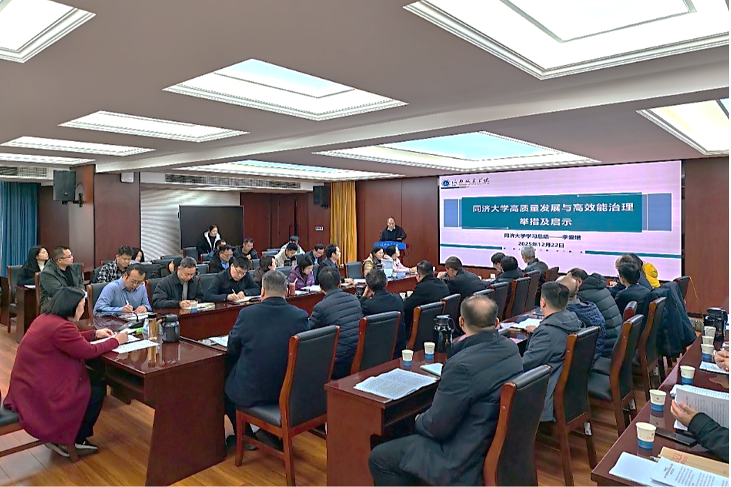 会上,学校高等工程教育研究所所长李爱增教授做《同济大学高质量发展与高效能治理举措及启示》专题分享,系统介绍了对同济大学调研的学习成果,重点围绕“人工智能赋能专业升级”“学科交叉融合机制”“科研组织模式创新”等方向,探讨和提出可供借鉴的思路和举措。科技处有关同志结合当前形势,对2025年度科研工作的指标数据进行通报,对组织申报2025年度省级科技研发计划联合基金(学科类)项目工作进行具体部署安排,要求各学院高度重视,精心组织,确保实效,严格按时间节点完成任务目标。
