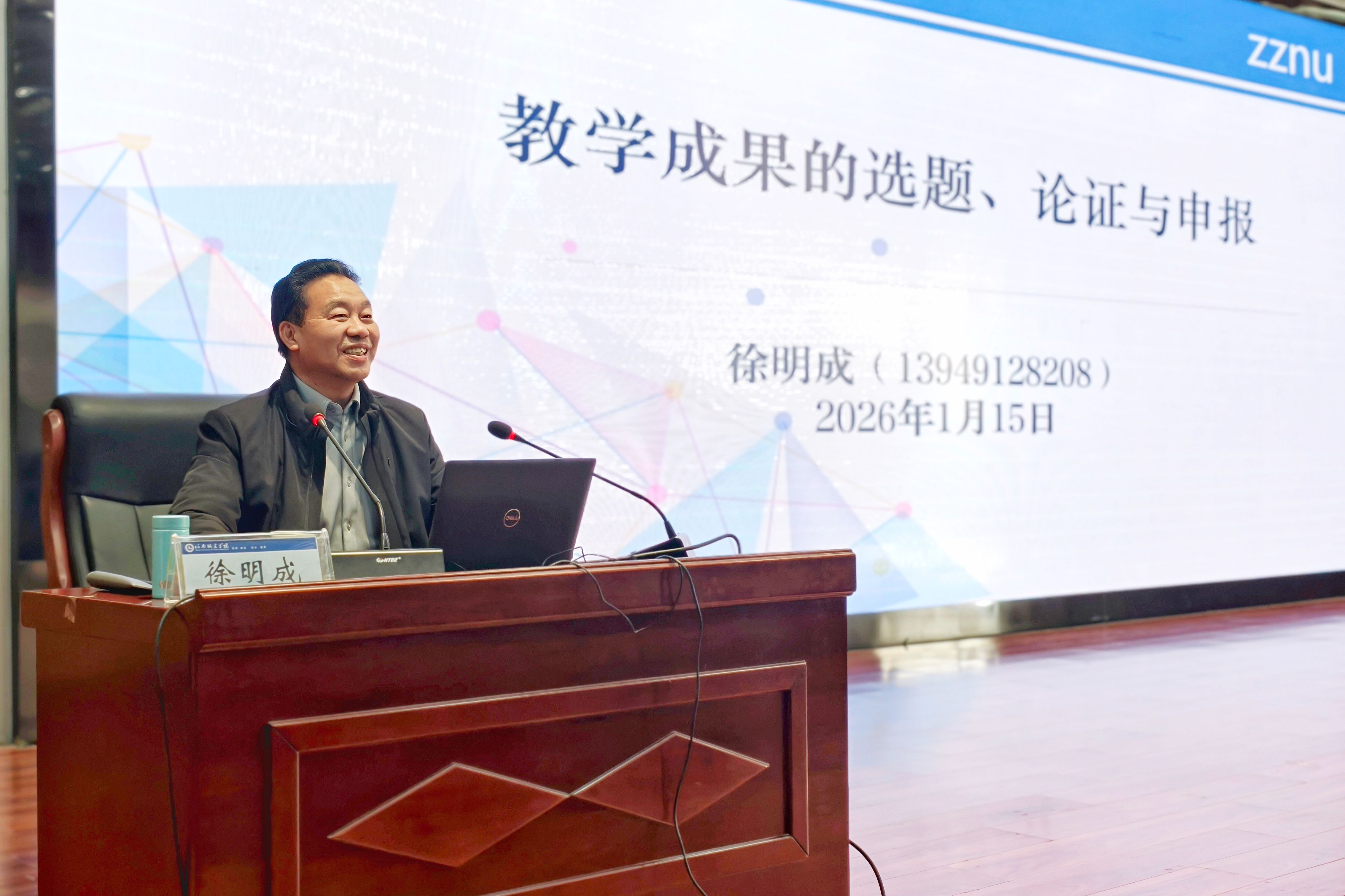为深化教育教学改革内涵建设,进一步加强教学成果奖培育与申报工作,助推学校人才培养与教学成果提质增效,1月15日上午,我校在学术报告厅举办教学成果奖申报专题辅导报告会,郑州师范学院教务处处长、二级教授徐明成应邀作主题报告。报告会由教务处主办,人事处、教学质量监控与评估中心、实验室建设管理中心、高等工程教育研究所等部门负责人及相关人员、各教学院(部)院长(主任)、主管教学副院长(副主任)、专业负责人、2025年度校级教学成果奖项目负责人及团队主要成员参加报告会。
