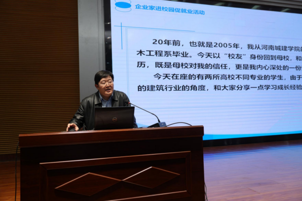 饮水思源,刘升始终牵挂母校发展。在他的推动下,平煤神马建工集团与河南城建学院建立长期人才合作机制,每年为母校学子提供实习就业岗位,助力青年学子成长成才。同时,他积极参与母校课程建设与教学改革,组织技术骨干进校园举办专题讲座,亲自返校分享行业前沿动态与工程实践经验,结合建工集团创新技术案例,为学弟学妹们讲解BIM全生命周期应用、建筑机器人施工等新技术的实践价值。此外,建工集团依托河南城建学院平台举办三期技术员、新员工能力提升培训班,实现校企资源共享、协同育人。